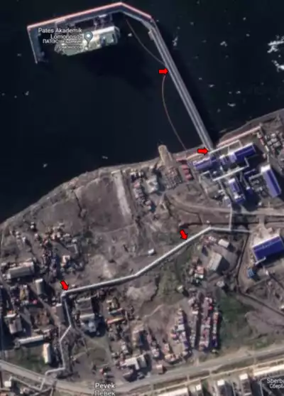 The reactors also produce 300 MW of thermal energy that supplies heat to Pevek, reducing the pollution caused by previous methods of heating. In the aerial photo, the red arrows point to the piping used to provide heat to buildings in the city.