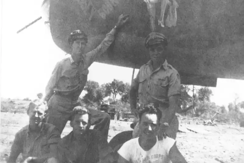The crew of B-25J 9P in better times. Pictured from left to right are John Buchanan, Fred Swanson, two unidentified airmen- possibly William Williamson and Luther Craver- and Baxter Thomas.