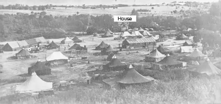 "What you see is the prime 489th area with the mess area at the bottom of the hill and the administrative area off to the right. Most of the enlisted men bunked here. The officers' area was out of the picture to the right. My tent was the large white one in the left foreground." The old RR station/house where Rose, Guy and Ange lived is marked. That's the Tyrrhenian Sea in the background. My dad said that if they could see the island of Elba (or possibly the islands Monte Cristo and Pianosa) when they woke up in the morning they knew they were going to fly missions that day. ("Able was I ere I saw Elba." Try spelling that backwards. Napolean was born on Corsica by-the-way).